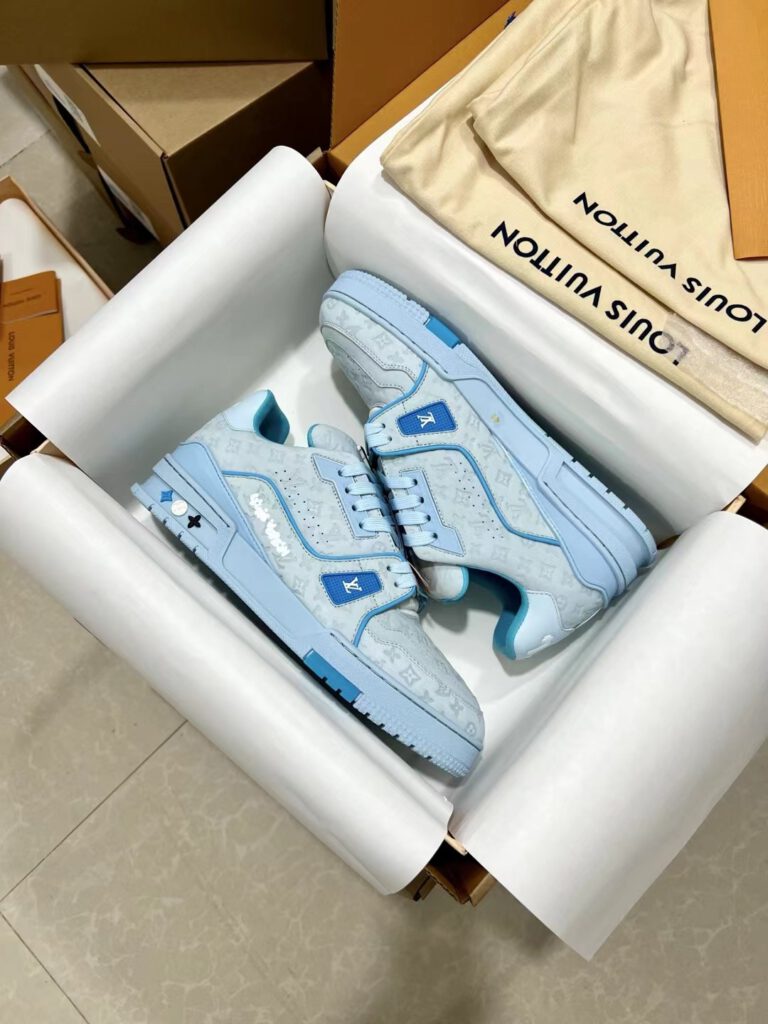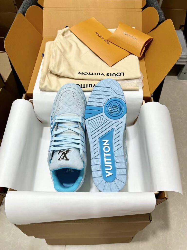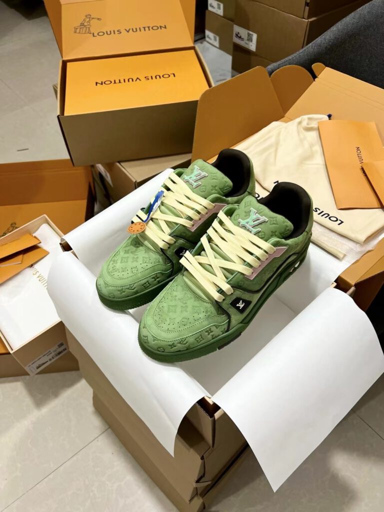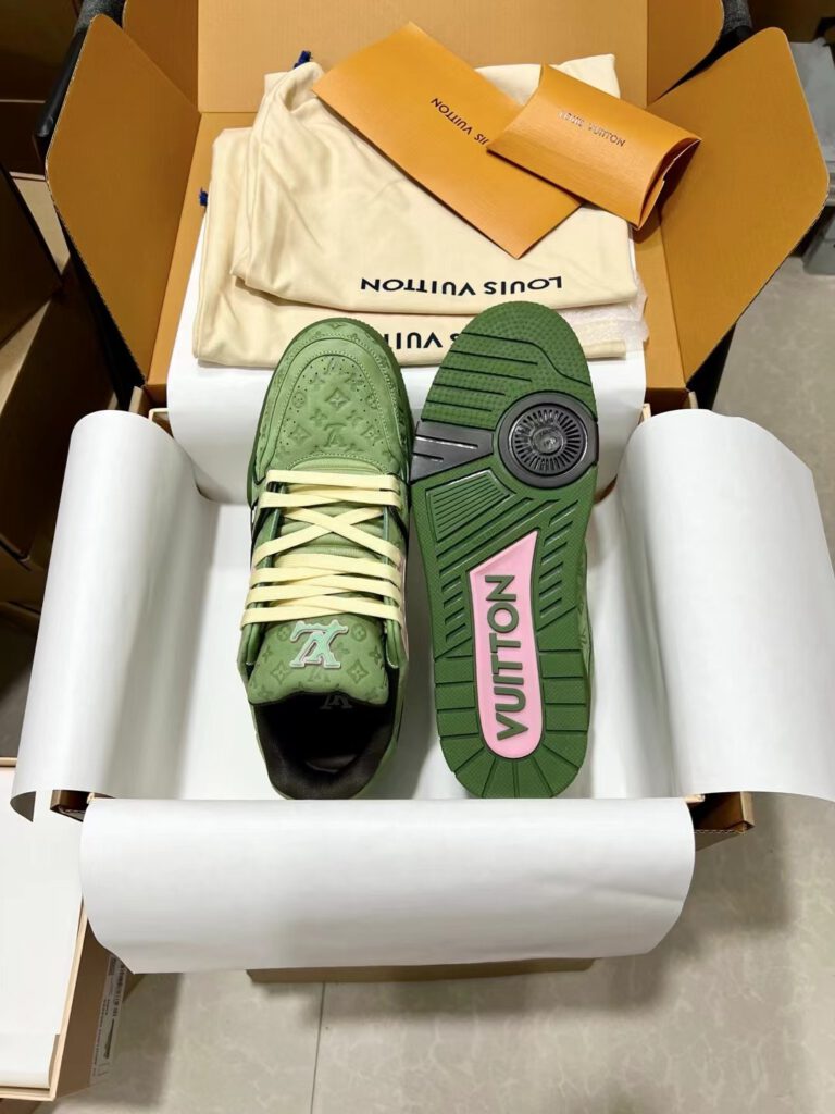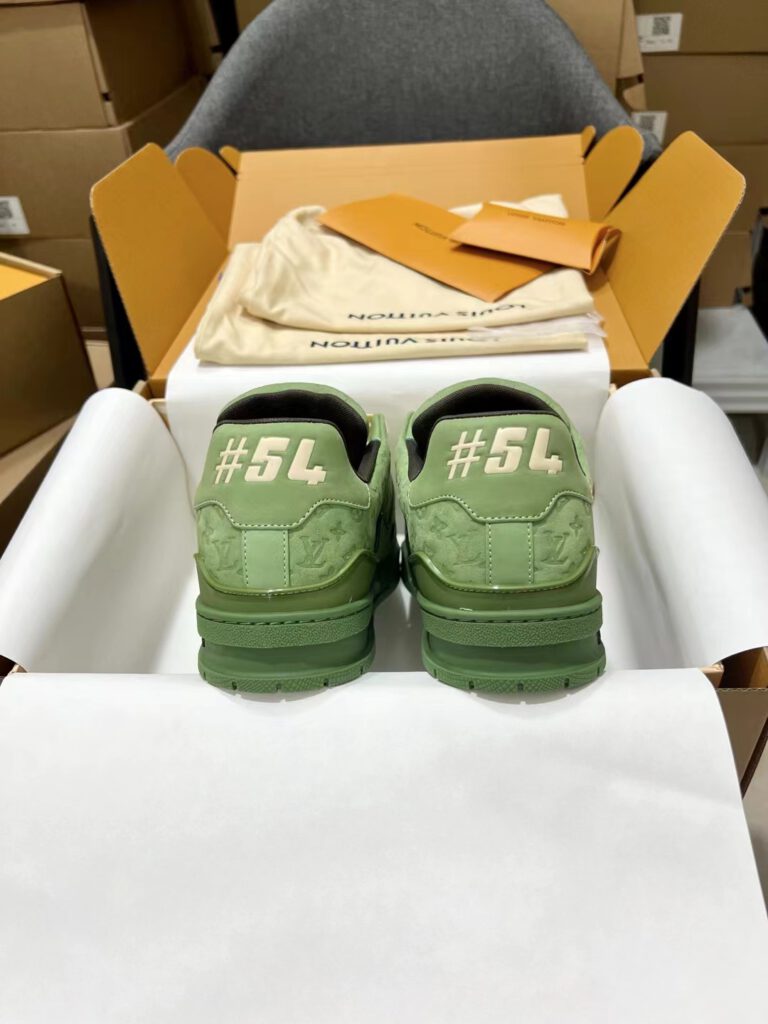 Releasing as part of a collaborative menswear capsule, the Tyler, the Creator x Louis Vuitton Trainer ‘Green’ delivers the Odd Future founder’s take on the casual sneaker, made in Italy and originally designed by Virgil Abloh. A vibrant green hue is executed on the calf nubuck upper, featuring Tyler’s interpretation of Louis Vuitton’s iconic monogram pattern. Pink accents land on the molded eyestay and the raised LV logo that graces the tongue. Additional branding elements include ‘Louis Vuitton’ printed in hand lettering on the lateral side and ‘#54’ stamped on the back tab. The sneaker rests on a rubber cupsole that accentuates the shoe’s retro-inspired aesthetic.